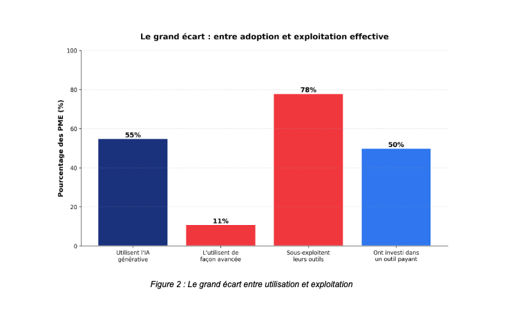 55% des TPE-PME utilisent l’intelligence artificielle générative fin 2025. Mais seules 11% en font un usage avancé. Entre ces deux nombres se cache la frontière entre ceux qui testent et ceux qui transforment.