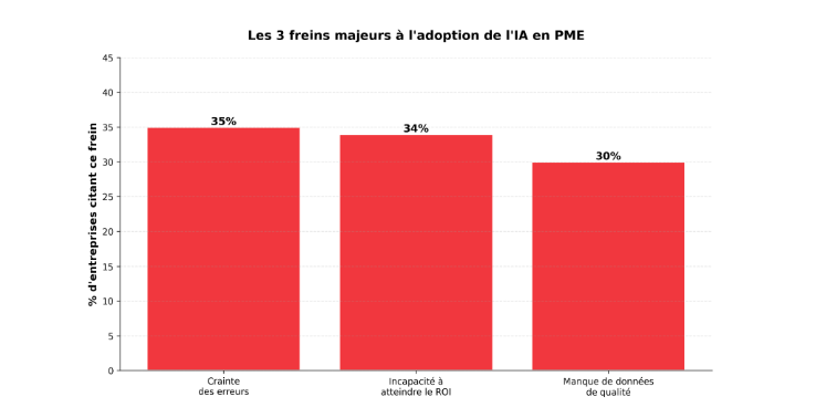 35% : Crainte des erreurs — Les équipes testent sans cadre, l’IA fait des hallucinations, la confiance s’effondre
